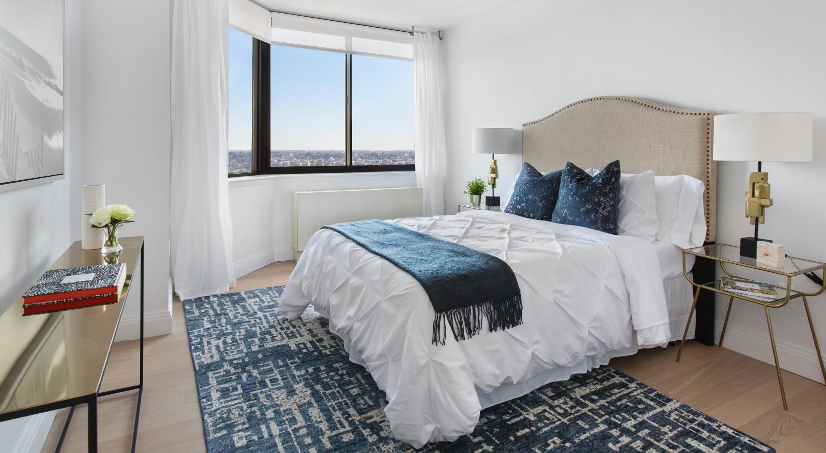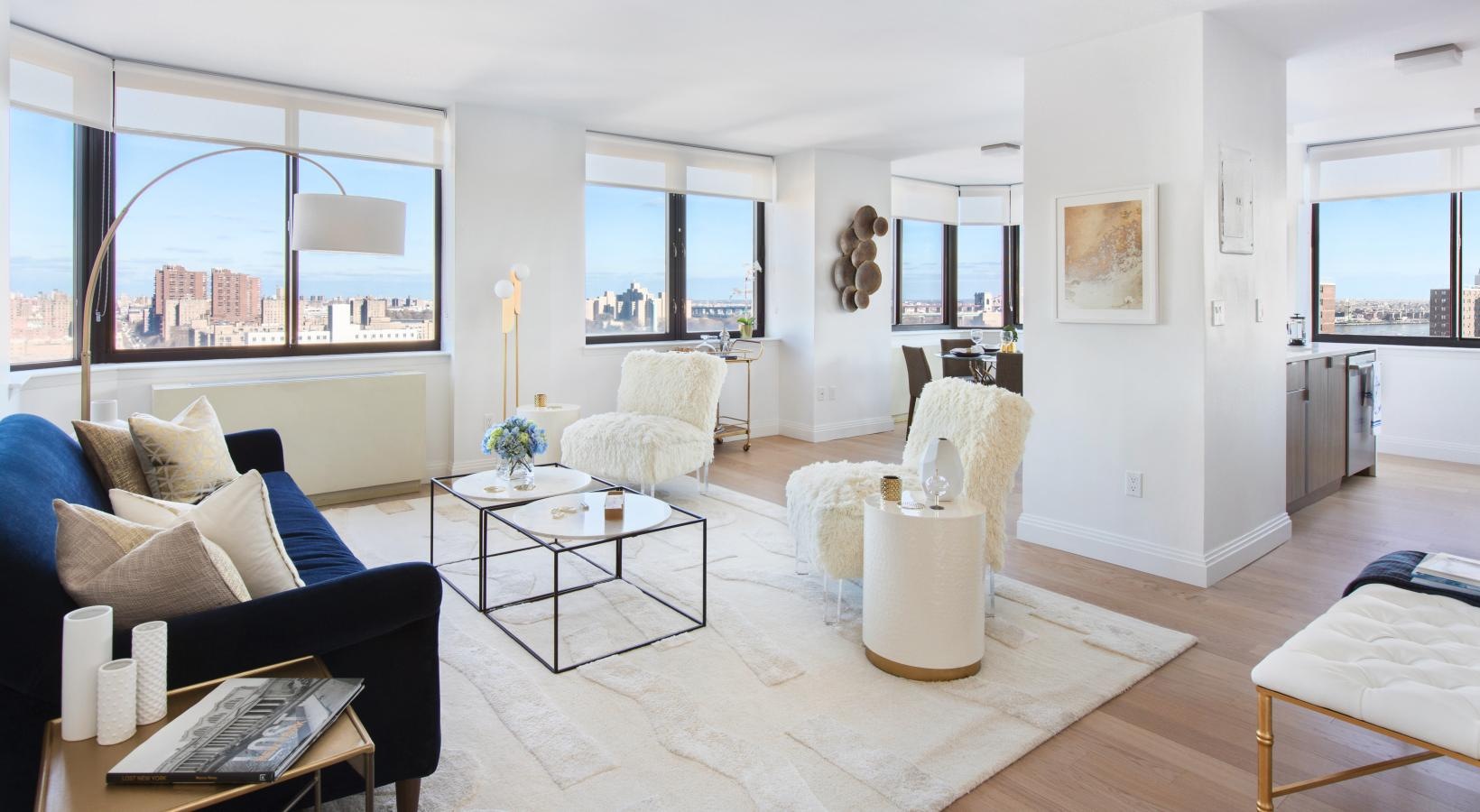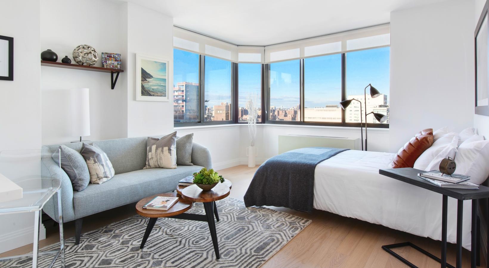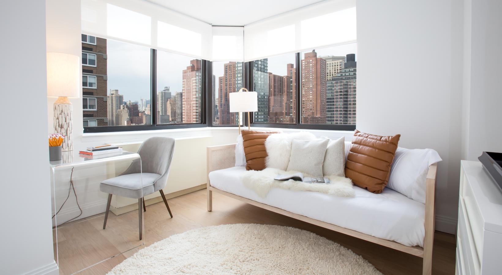 • a room with a couch and a window with a view of a city
